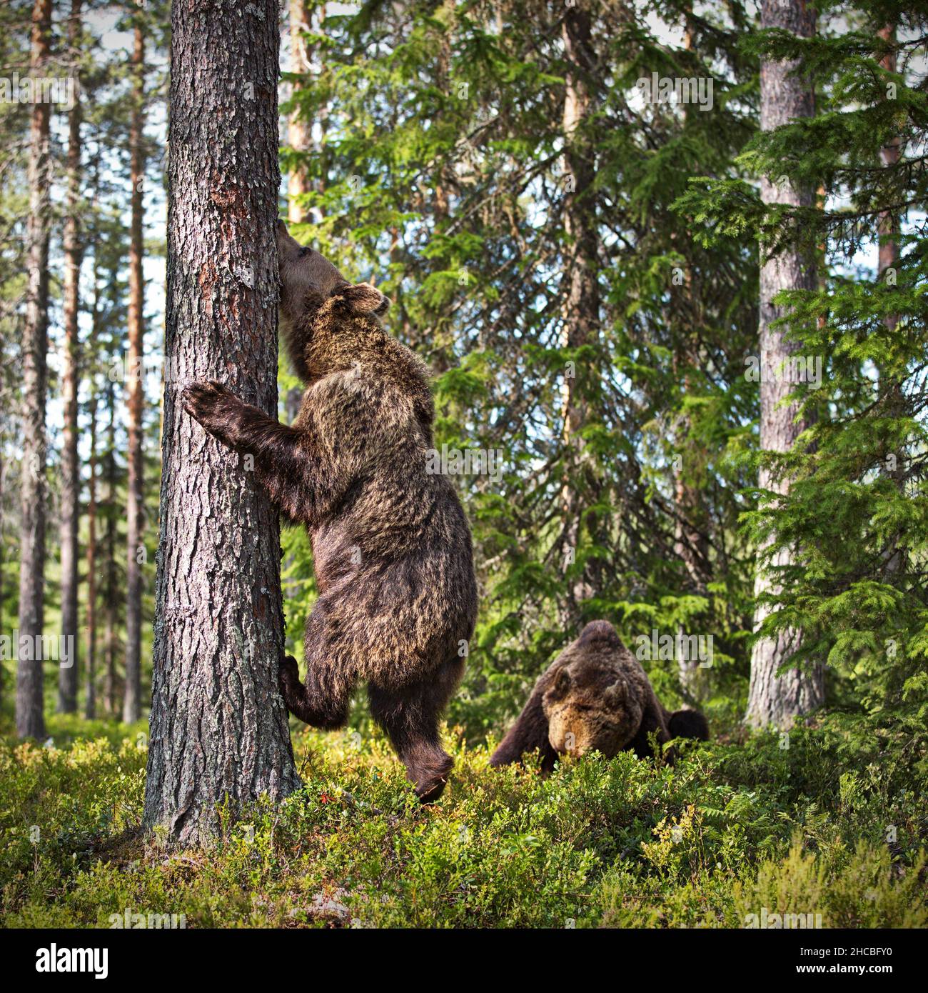 Closeup Of A Grizzly Bear Trying To Climb Up A Tree In A Forest In The Daylight In Finland Stock Photo Alamy